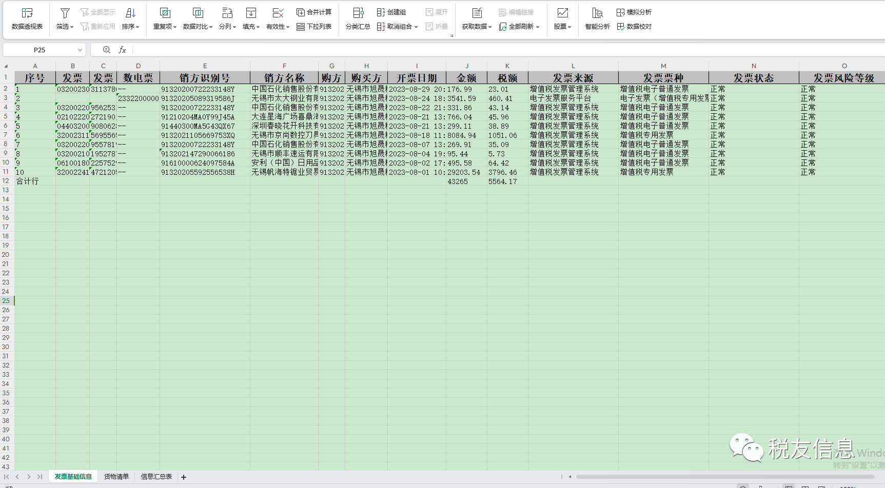 点击导出,选择导出全部,打开导出的表格,8月开的所有的发票数据都在这张表格里,(包括用盘开的纸票,现在用数电平台开的电票,红冲的发票,作废的发票),可以根据自己的需求筛选统计。
